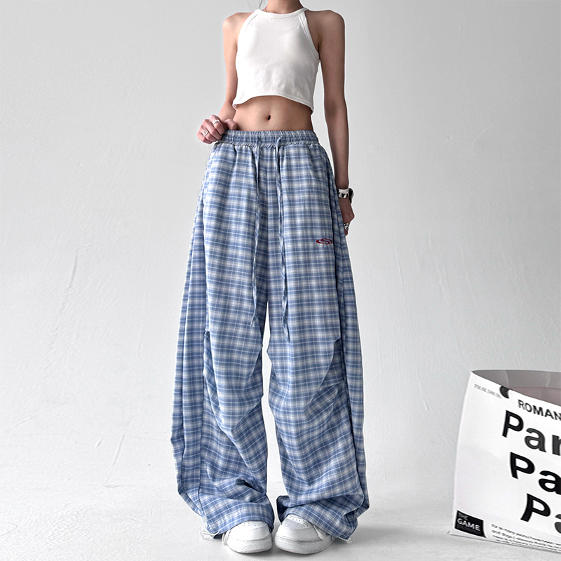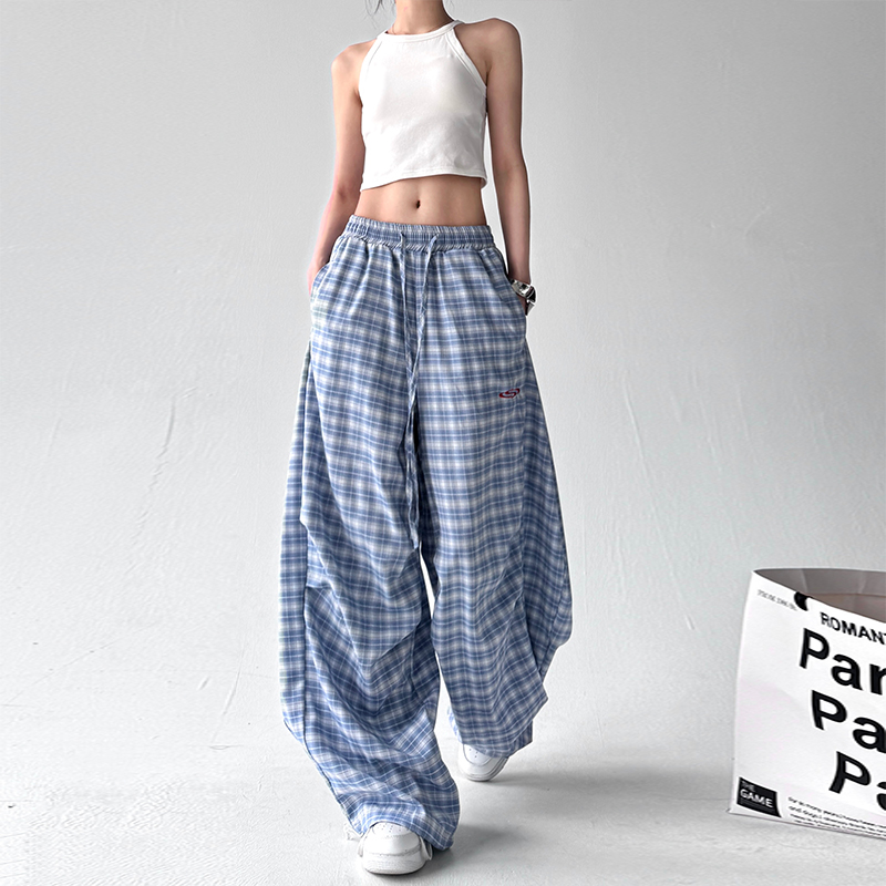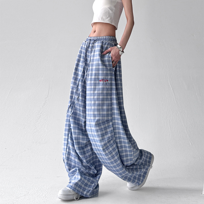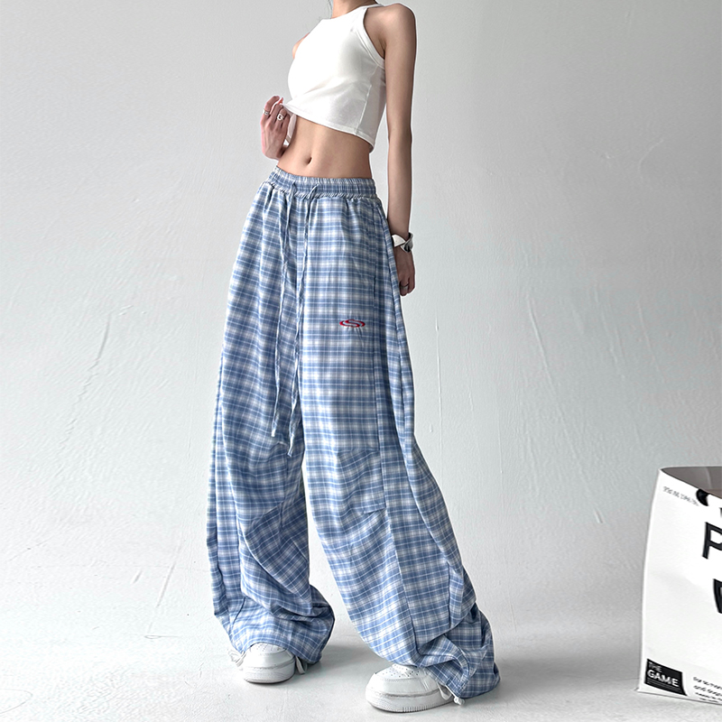 拖地微喇阔腿长裤 美式 子宽松bf慵懒风2025新款 蓝色格子休闲运动裤