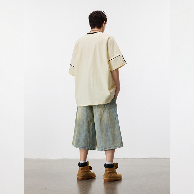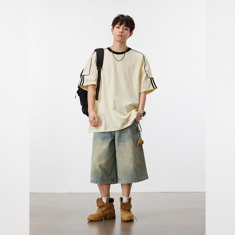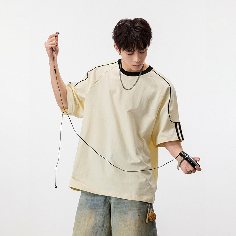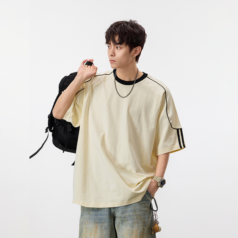 夏季 美式 潮牌宽松三条杠插肩T恤情侣半截袖 男款 条纹撞色拼接短袖
