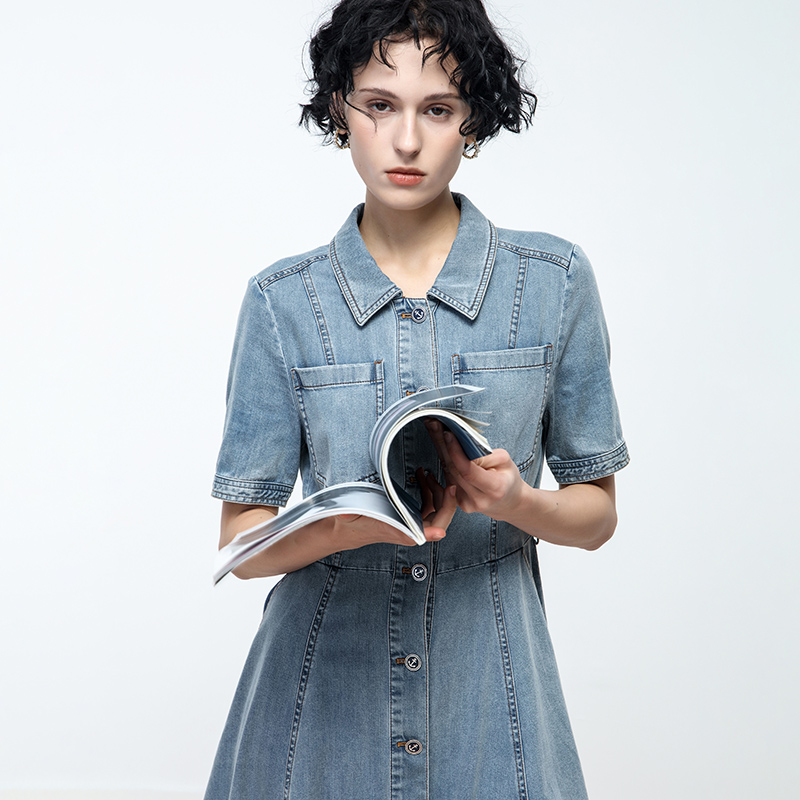 连衣裙气质通勤牛仔裙 女装 Keywearcloud奇威翻领单排扣中长款 夏季
