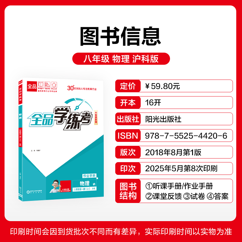 检测试卷 物理 8年级同步练习册 全品学练考 初中辅导书解题技巧 2025秋新版 沪科版 作业手册 八年级上下册 学习手册 初二单元