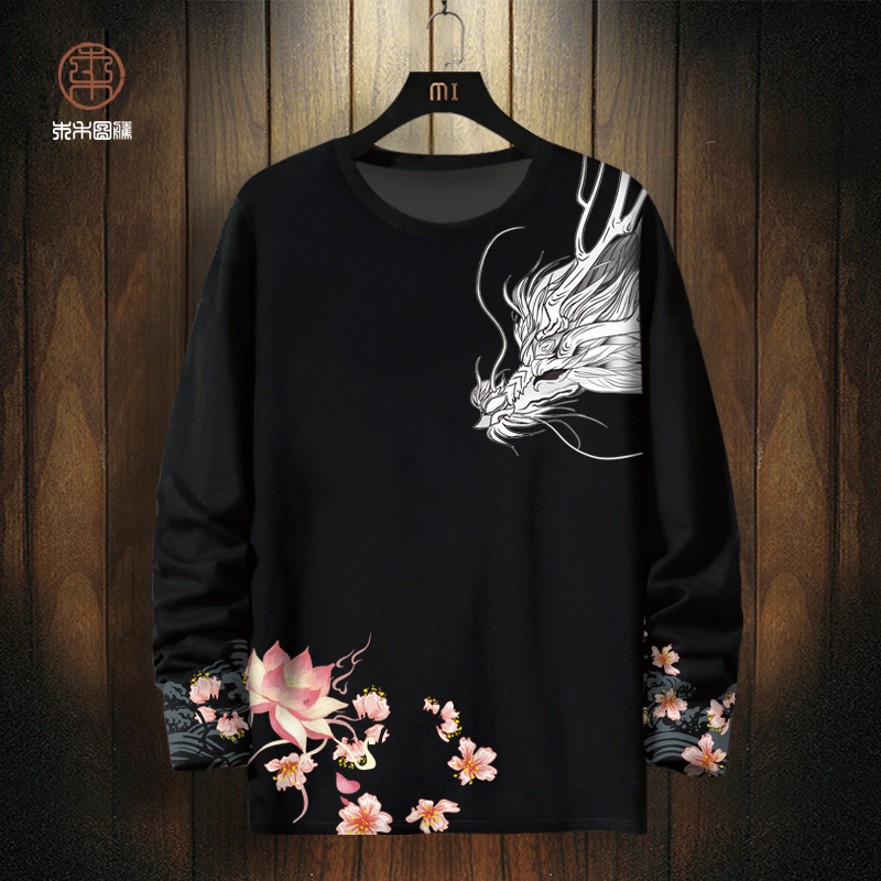 国潮龙图案长袖 显瘦休闲打底衫 T恤男生薄款 上衣修身 衣服 大码 春季