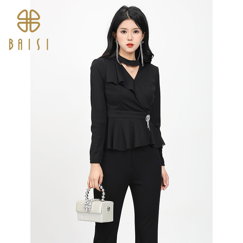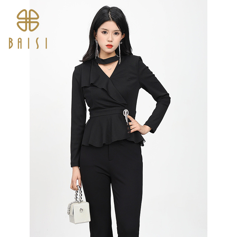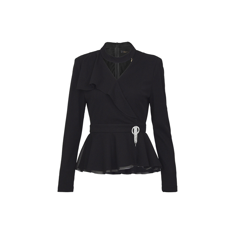 范暗黑西装 新品 上衣女 衬衣2025春季 百丝荷叶边镂空V领长袖