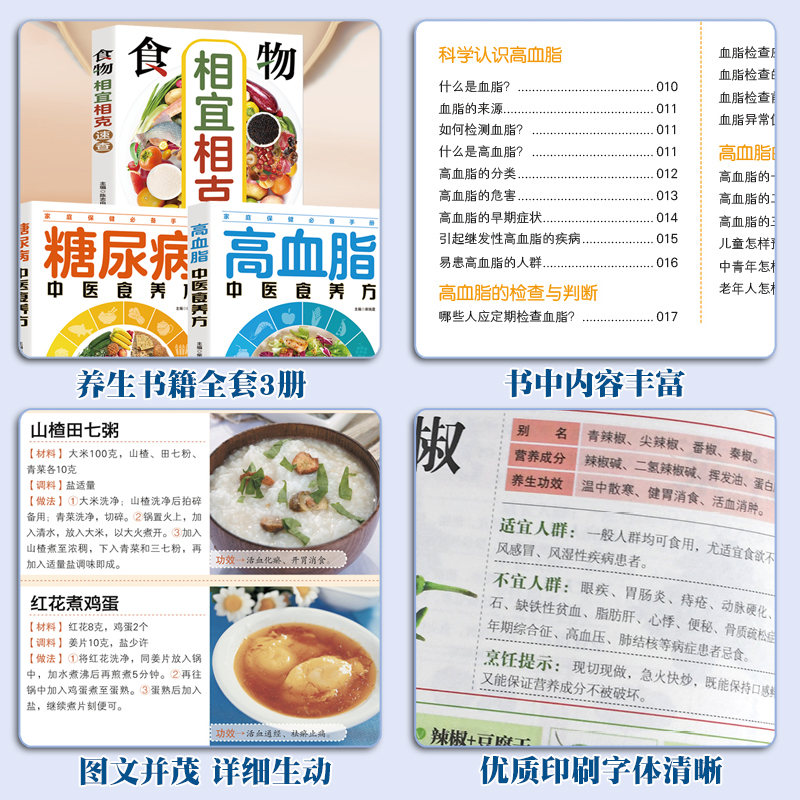 全3册 家庭保健手册 中医食疗养生 糖尿病中医食养方 中老年人保健养生 食物相宜相克速查 轻松降脂降糖 降低 高血脂中医食养方