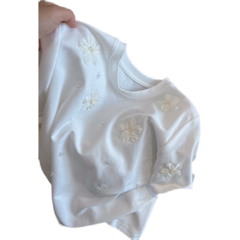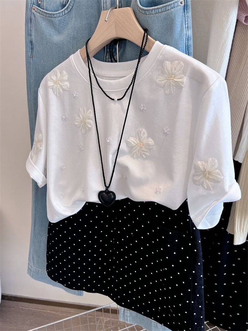 T恤女夏 立体山茶花刺绣钉珠甜美气质圆领显瘦纯棉短袖 法式 香香风