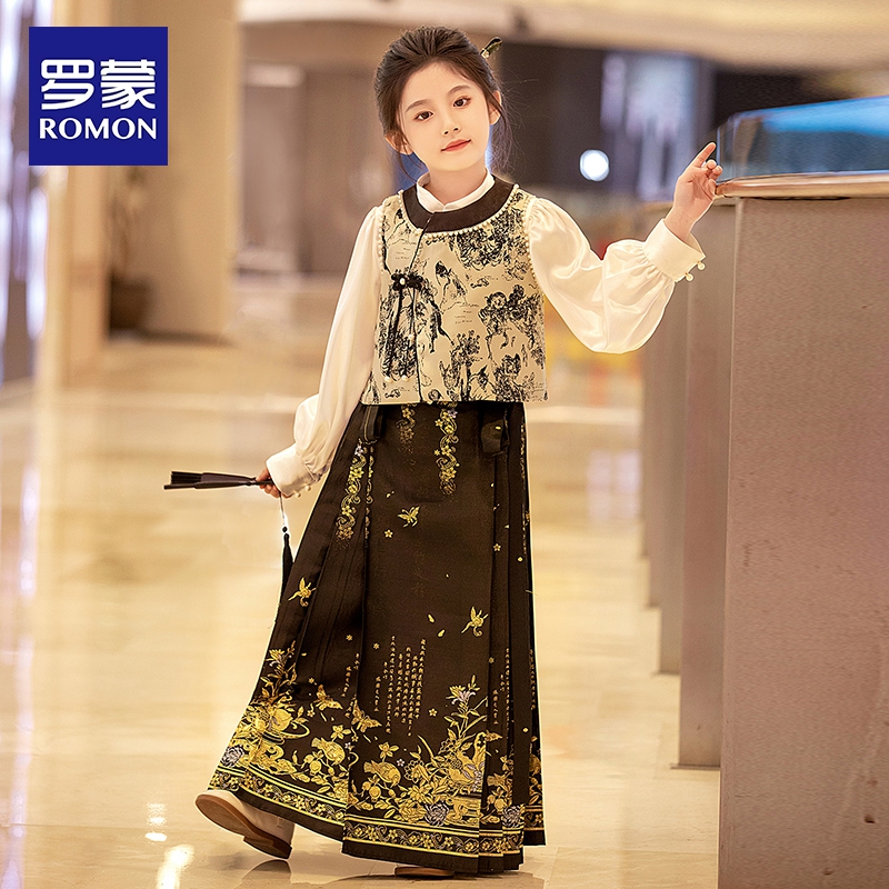 中国风古装 罗蒙新中式 2025新款 马面裙套装 儿童汉服演出服 女童衬衫