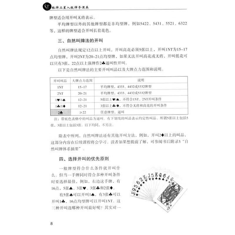 基本打法 自然叫牌法 应叫原则 叫牌基础与基本攻防 桥牌知识参考指南 优先原则 定约桥牌 选择开叫 桥牌二星入级牌手课本 特点