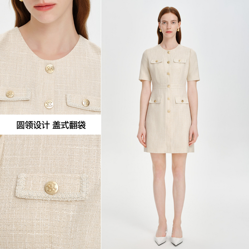 连衣裙通勤女裙夏 PRICH小香风粗花呢淡人气质圆领半袖 金银丝