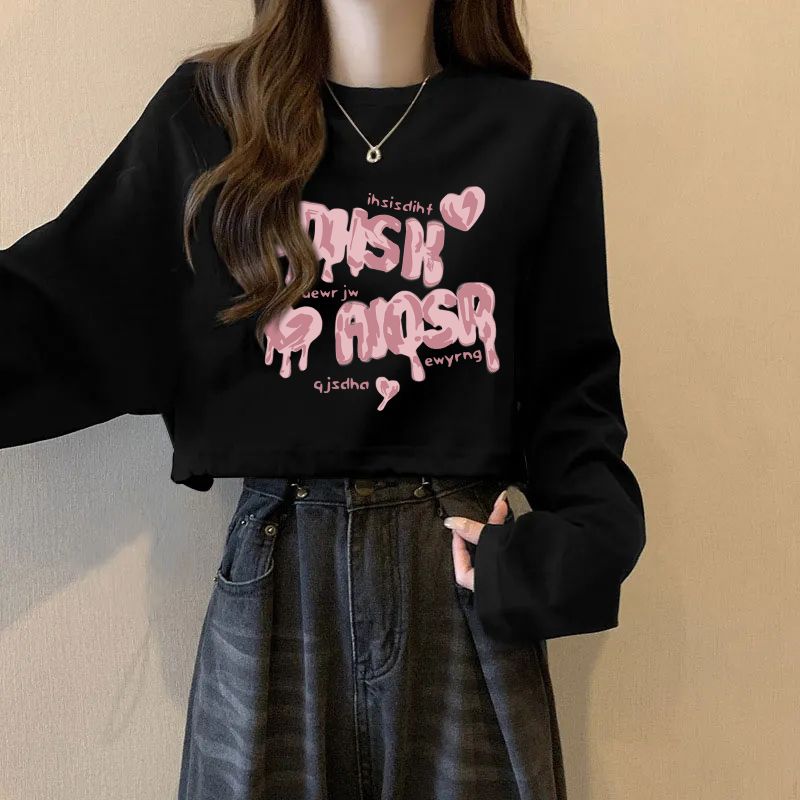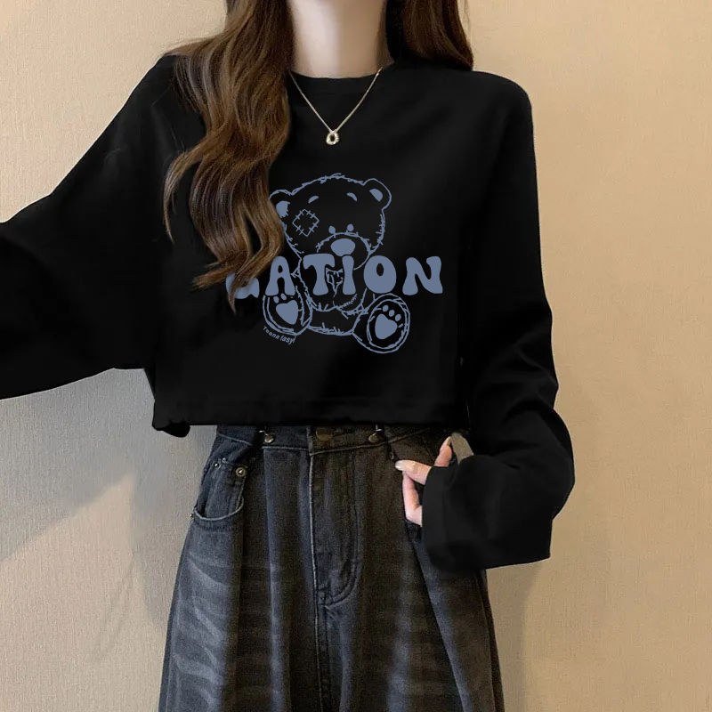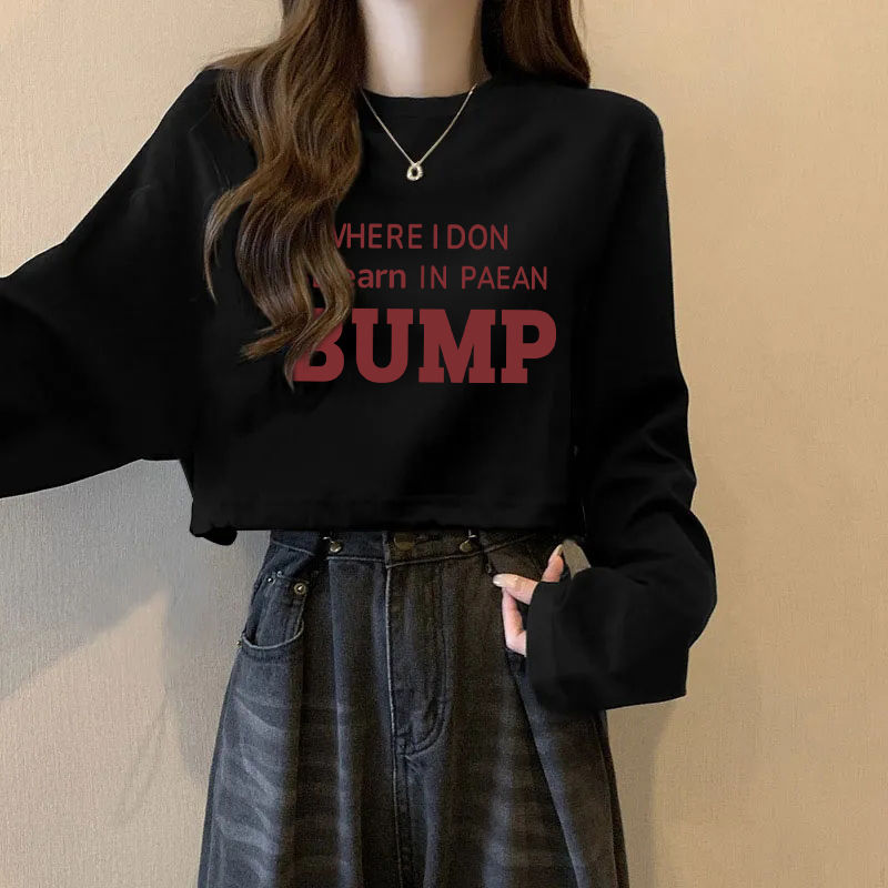 宽松高腰显瘦露脐短款 春秋新款 女韩版 t恤打底衫 上衣ins潮 黑色长袖