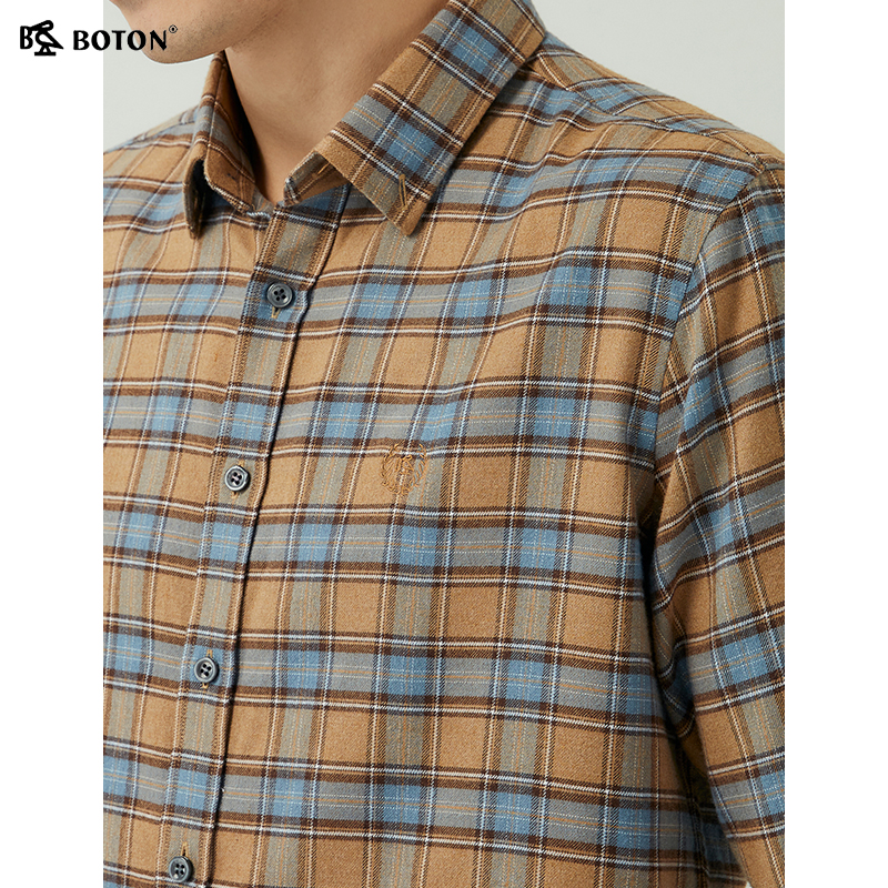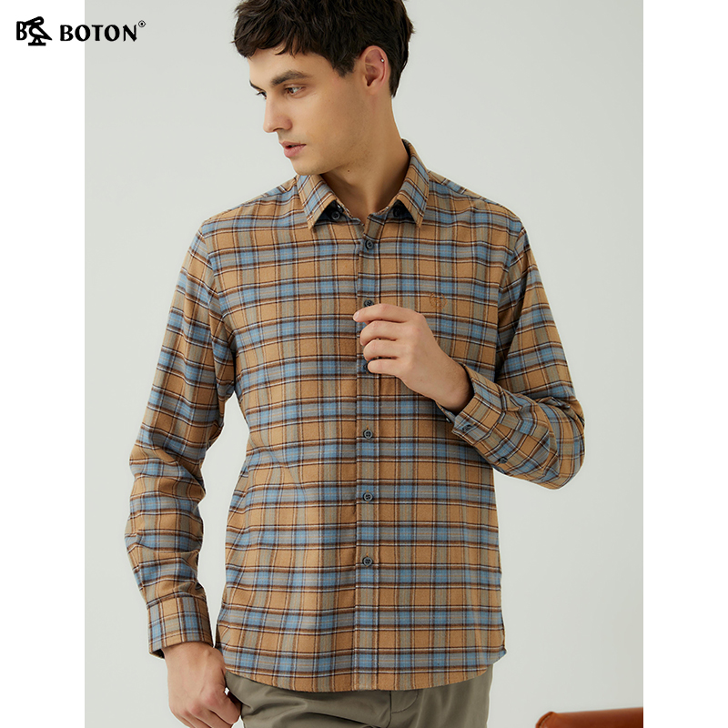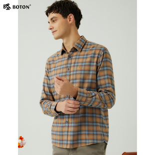 高端美式 杏蓝色格子磨毛衬衫 休闲英伦风衬衣 长袖 波顿2025秋冬新款