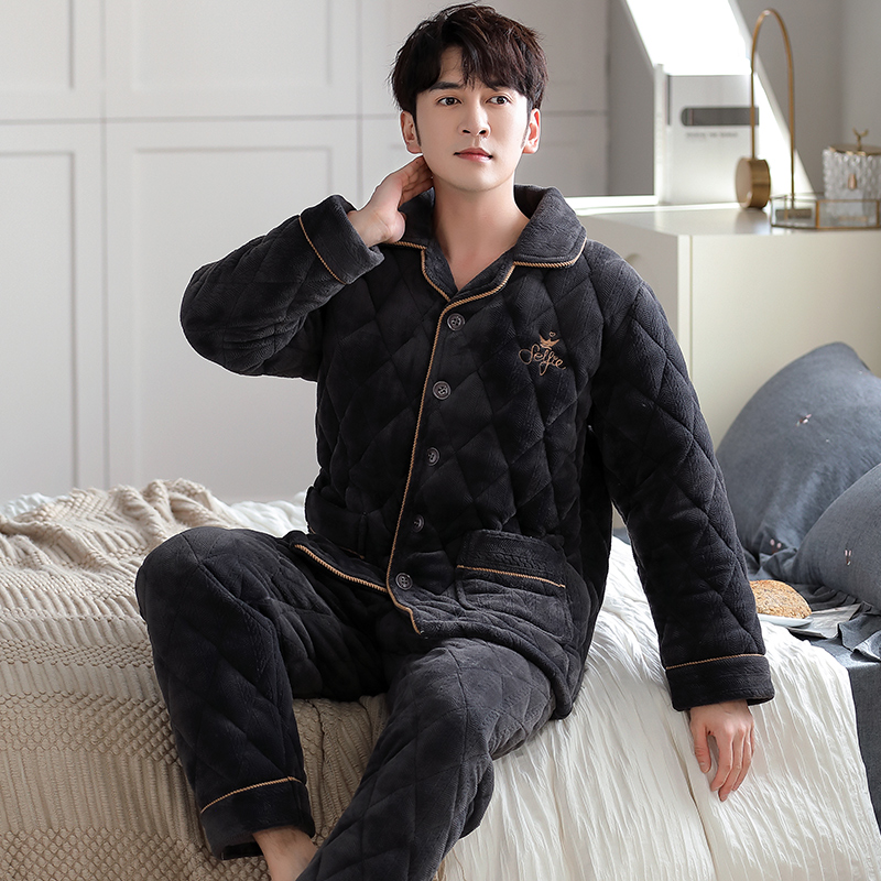 加厚加绒三层夹棉珊瑚绒保暖家居服 冬季 加肥加大码 中老年睡衣男士