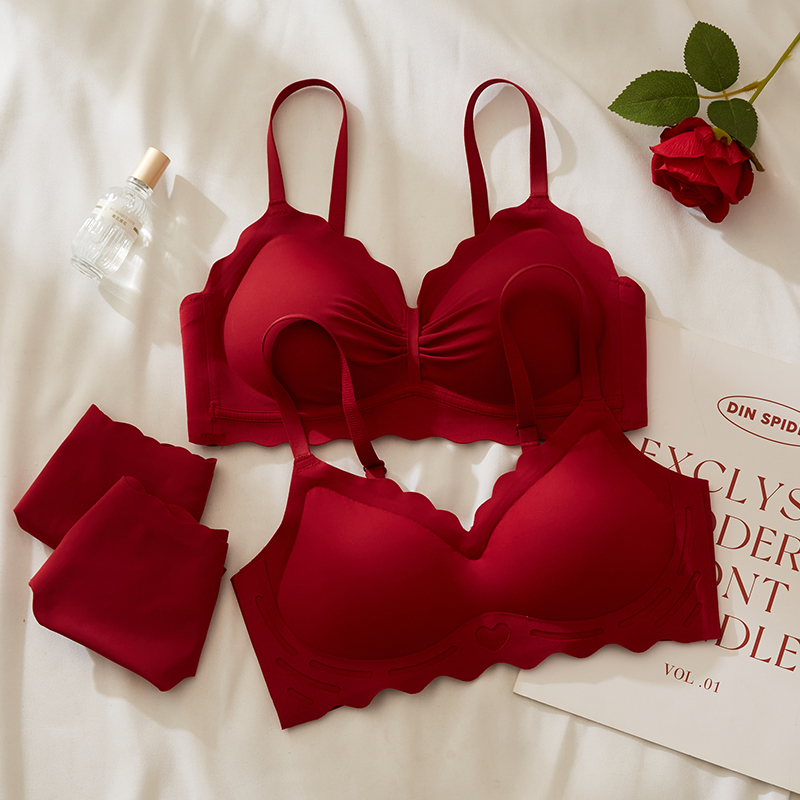 本命年内衣女红色转运无钢圈结婚新娘小胸聚拢性感文胸罩套装 薄款
