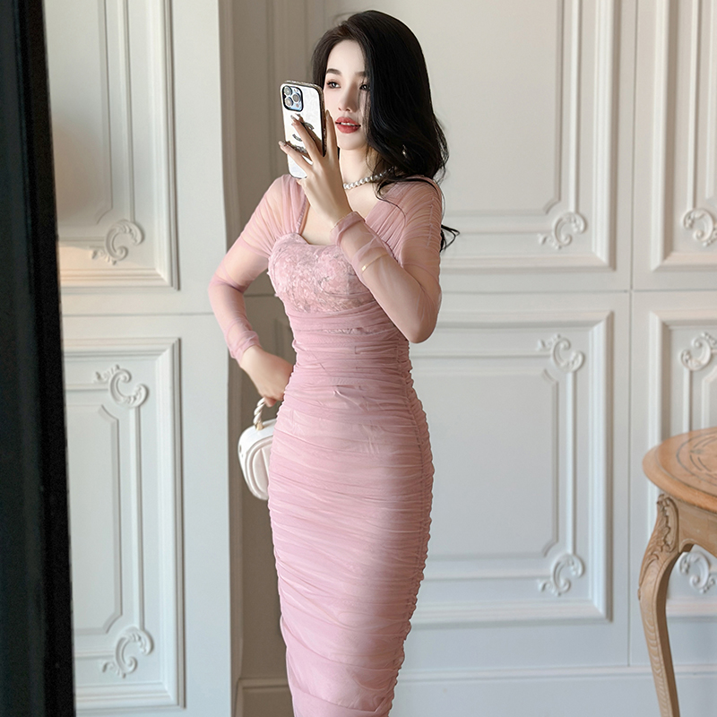 复古收腰显瘦A字中长裙子 新款 紫涵蕾丝花边圆领长袖 连衣裙女秋季