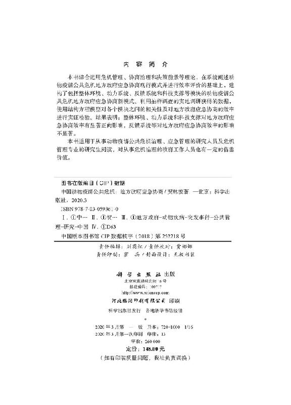 社书籍KX 中国动物疫情公共危机:地方政府应急协商9787030593610科学出版 书