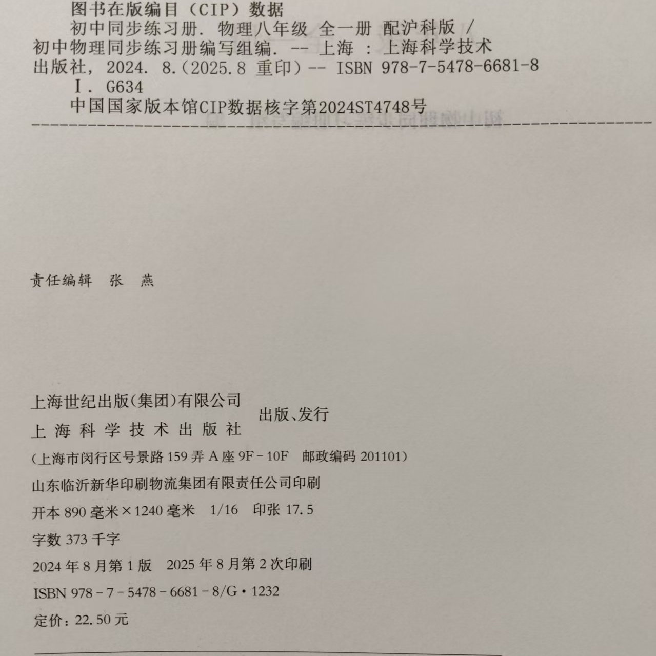 2025秋配沪科版 社初中八年级物理同步练习册全一册 初中同步练习册物理八年级全一册上海科学技术出版