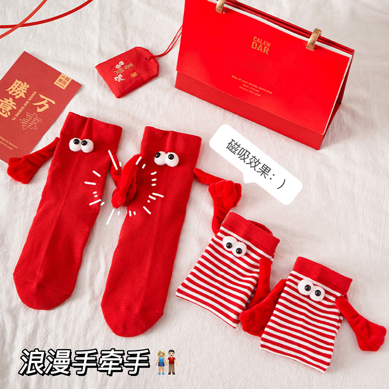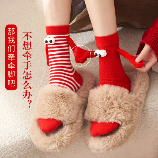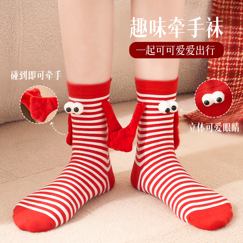 本命年红色袜子女搞怪牵手情侣中筒袜磁吸条纹秋冬季 送礼新年袜子