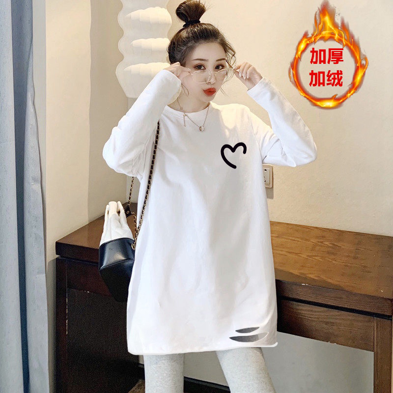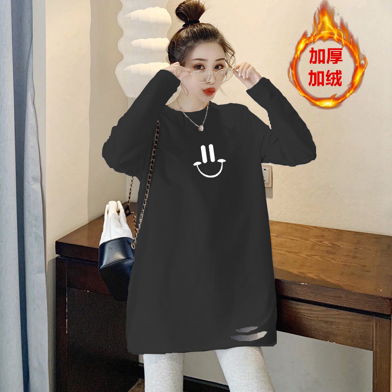 t恤上衣服 加绒加厚长袖 秋冬内搭打底衫 女叠穿卫衣洋气破洞中长款