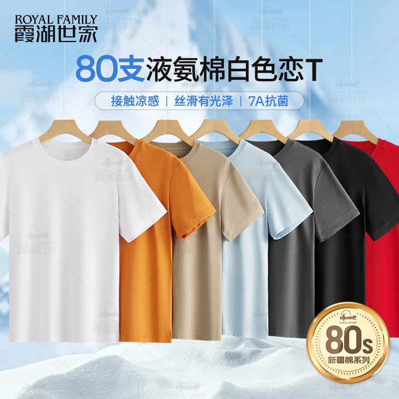 167 霞湖世家80支t恤男女抗菌液氨圆领短袖 情侣超高支长绒棉