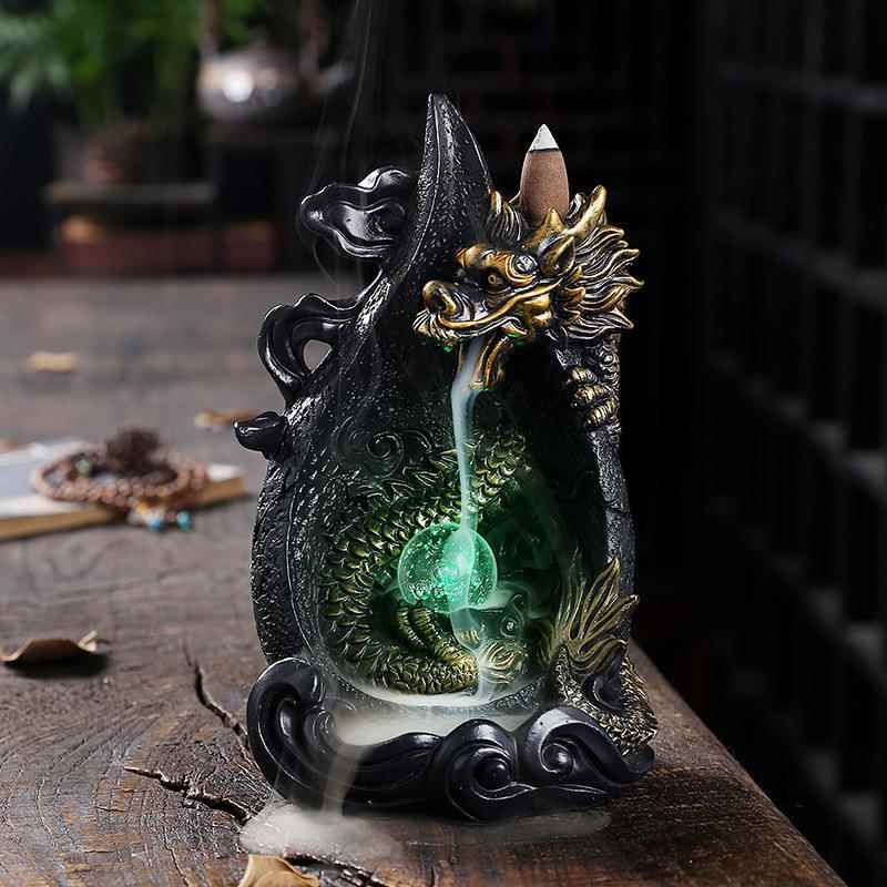跨境树脂烟倒流香薰炉 创意大号龙LED灯瀑布回流香器工艺品摆件