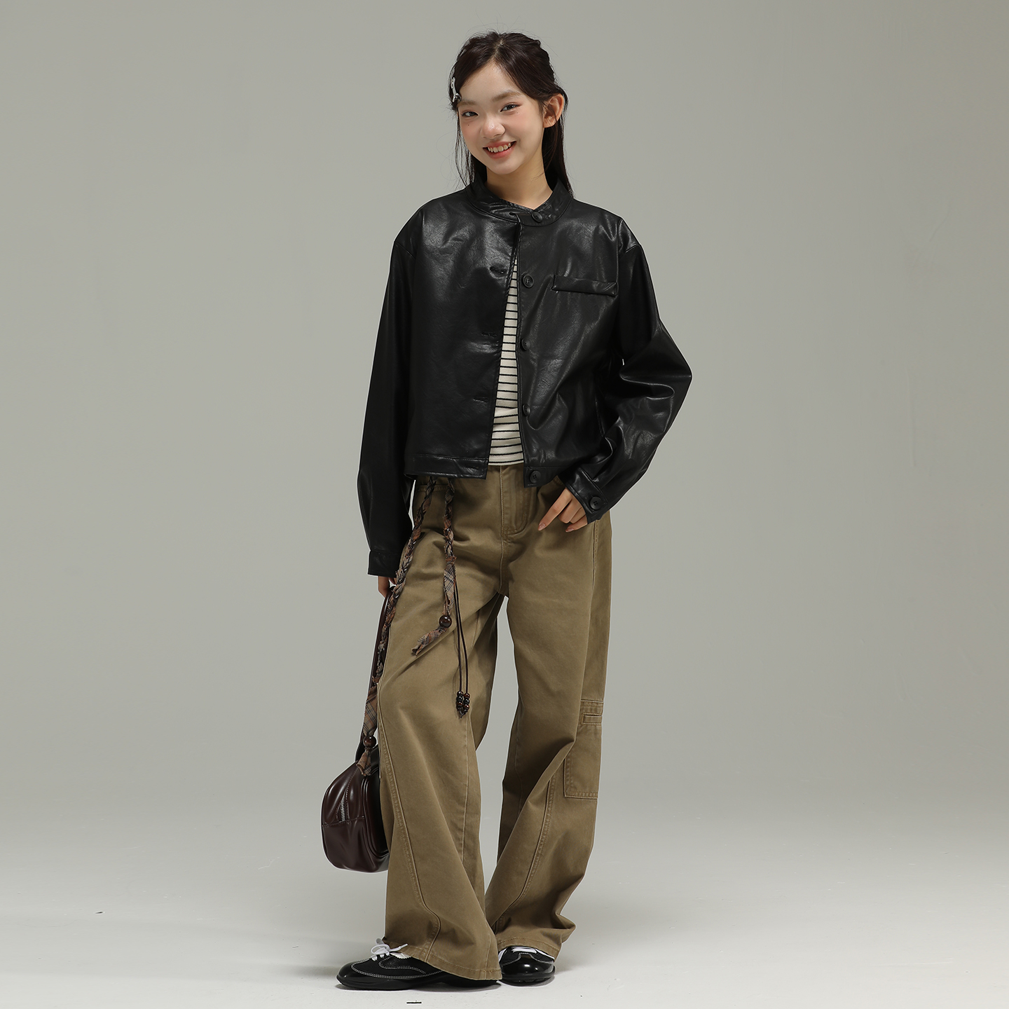 小女森女童春秋外套黑色质感短款 皮衣儿童pu皮圆领机车夹克上衣女