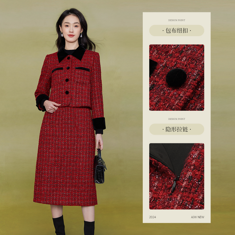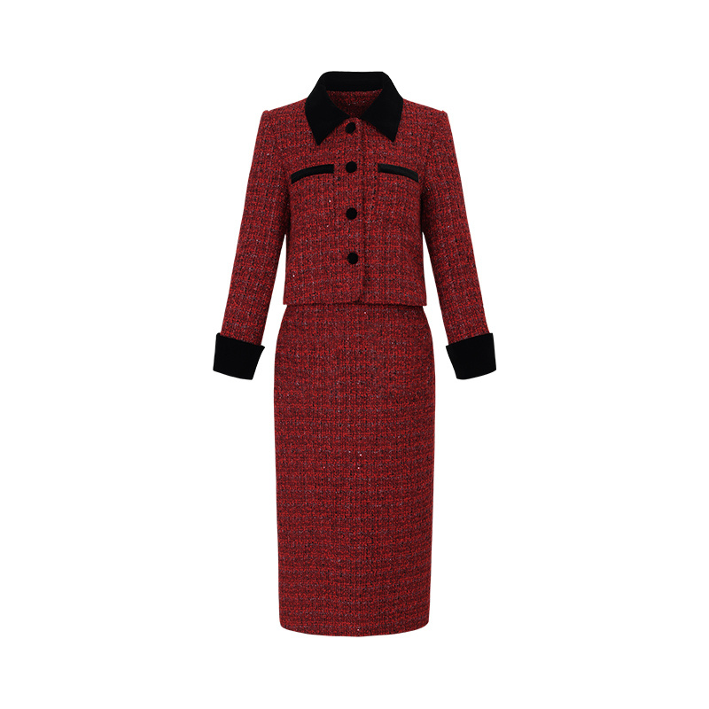 黛玛诗秋冬新款 优雅短外套半裙两件套气质名媛红色套裙 小香风套装