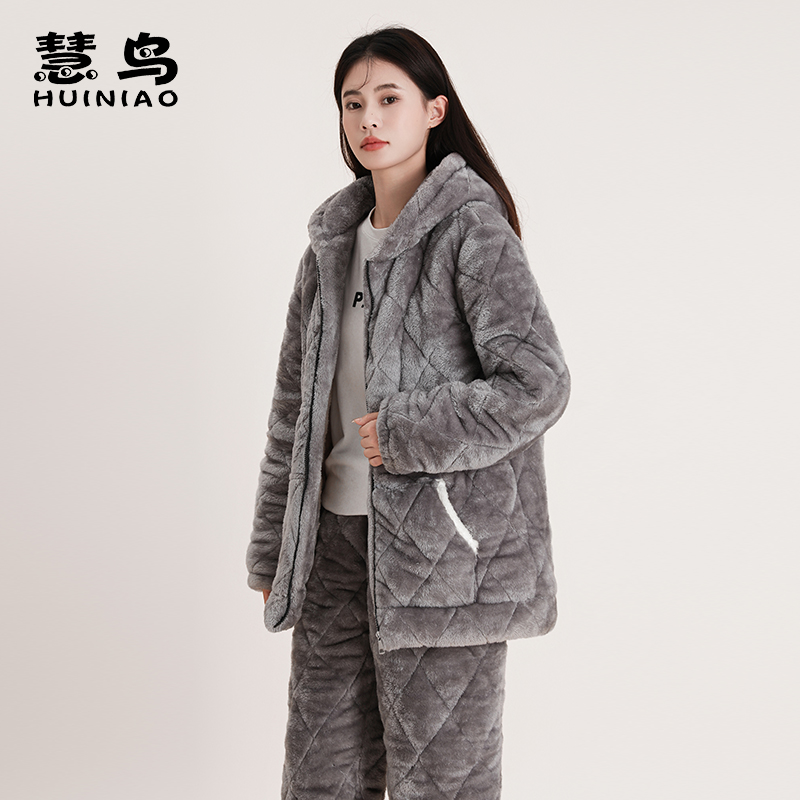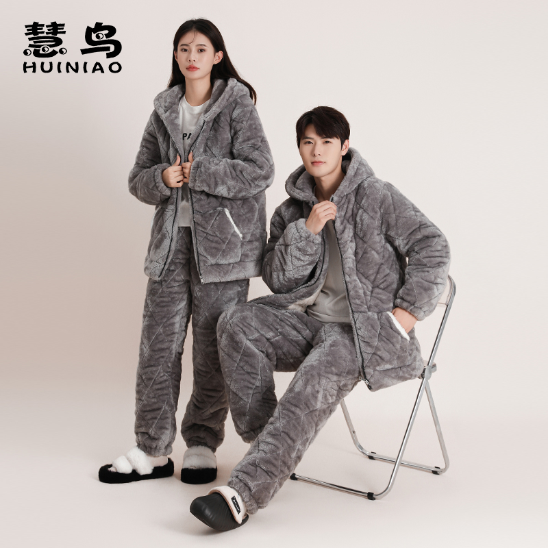 加绒加厚保暖珊瑚绒家居服连帽外穿套装 情侣睡衣男女2023冬季 新款