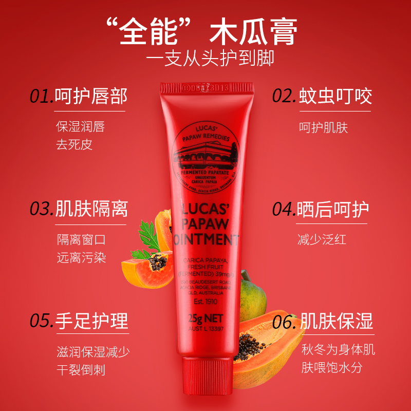 澳洲Lucas番木瓜膏万能保湿 婴儿霜淡化唇纹去死皮唇膜修护润唇膏