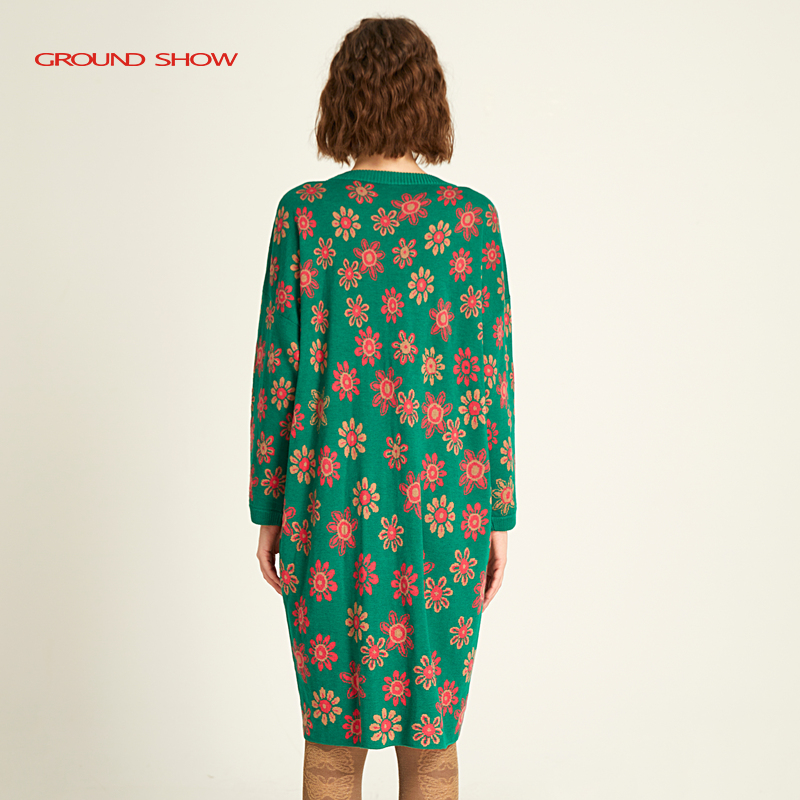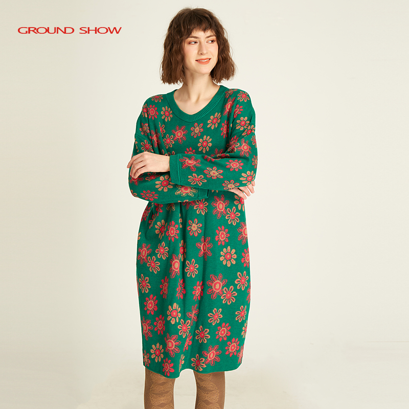 阁兰秀红绿提花针织连衣裙羊毛圆领长袖 直筒宽松A字裙中长毛衣裙