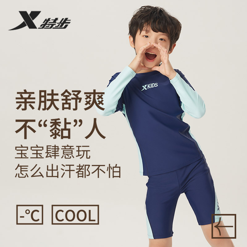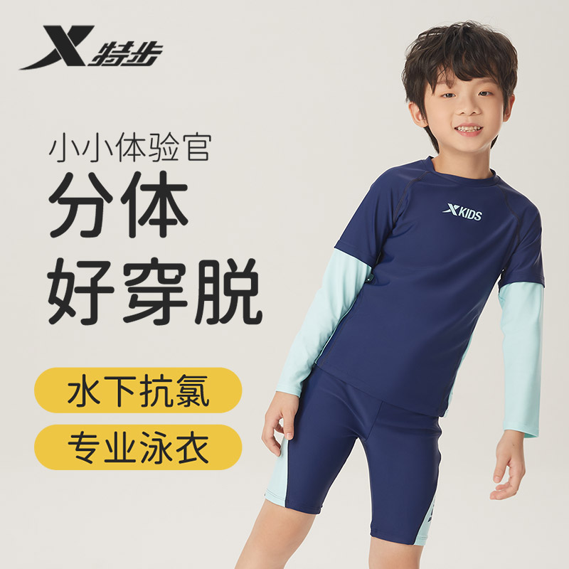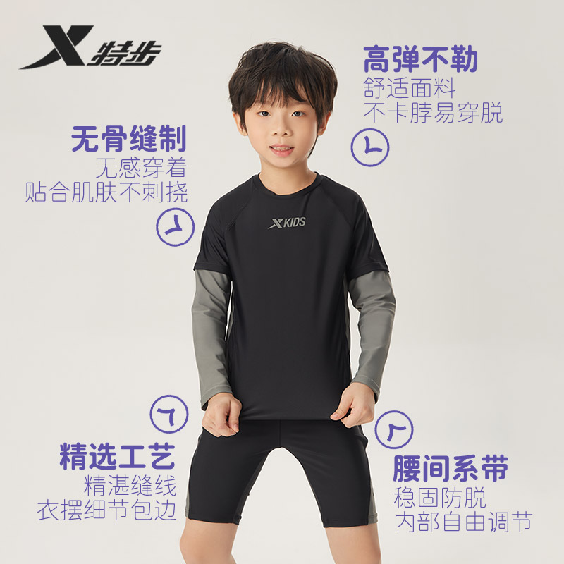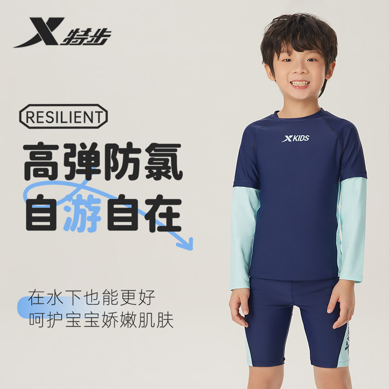 中大童男孩泡温泉游泳裤 泳装 泳衣男童2025年新款 特步儿童分体长袖