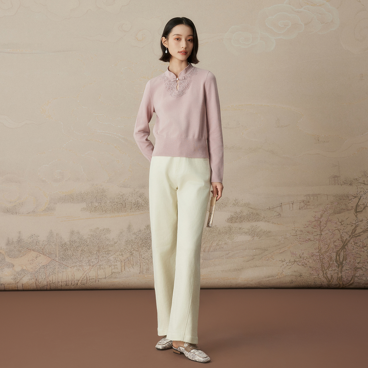 VGRASS维格娜丝秋季 棉混纺花边蕾丝女士针织上衣 新款