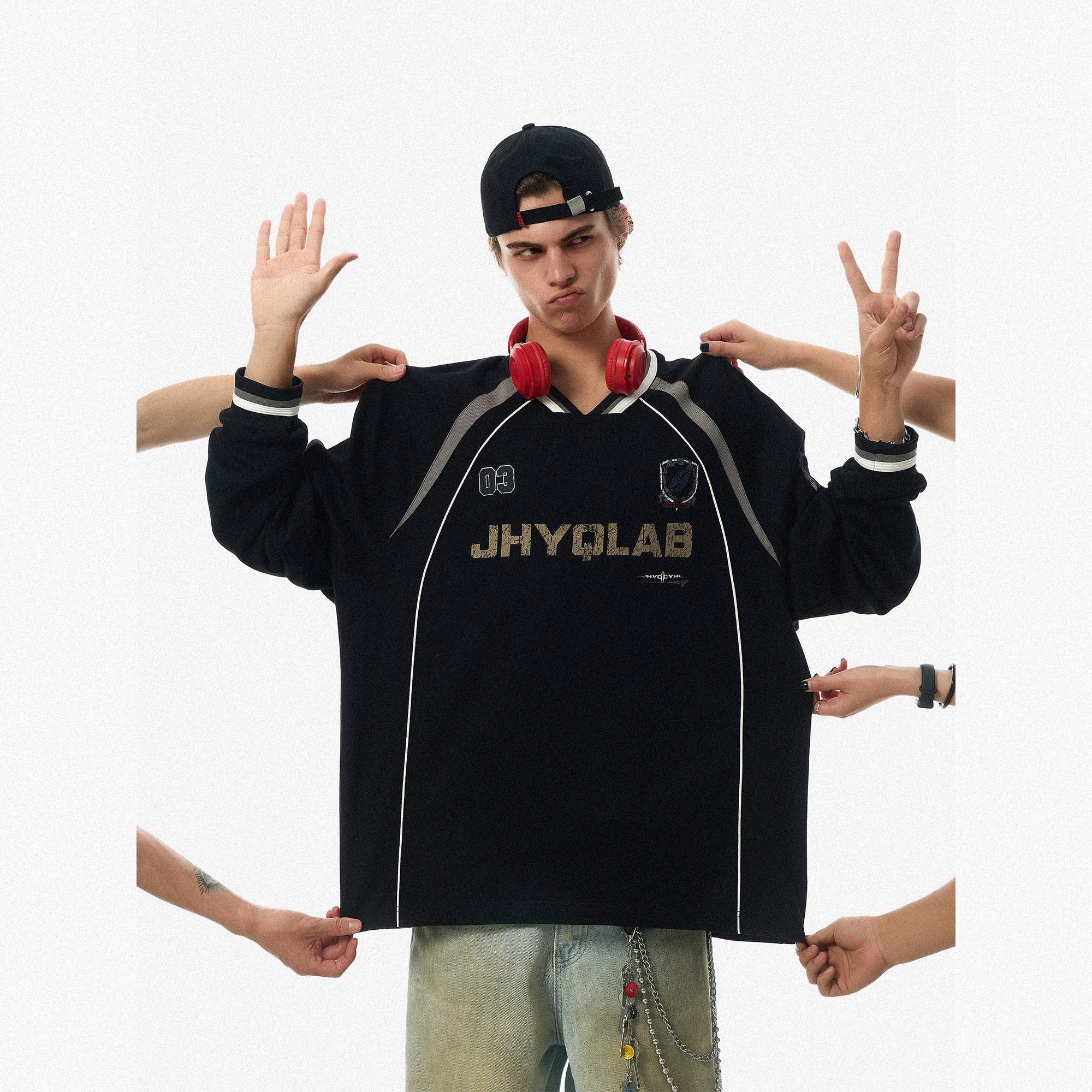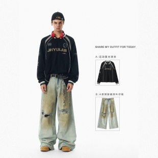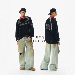 JHYQ美式 嘻哈宽松插肩T恤男宽松休闲棒球衣服 运动复古街头V领长袖