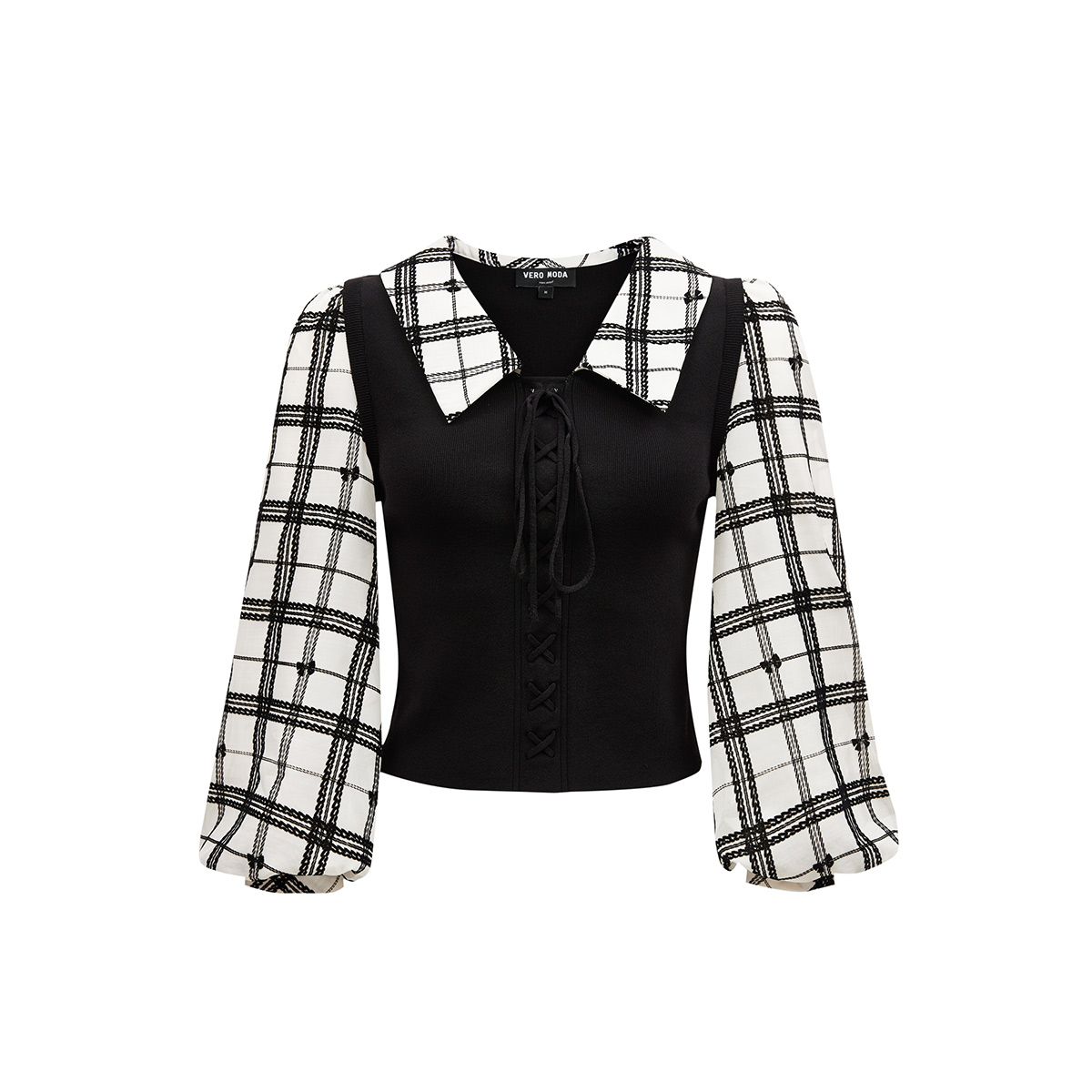 翻领泡泡袖 Vero 七分袖 24秋短款 系带拼色学院风324358006 Moda衬衫