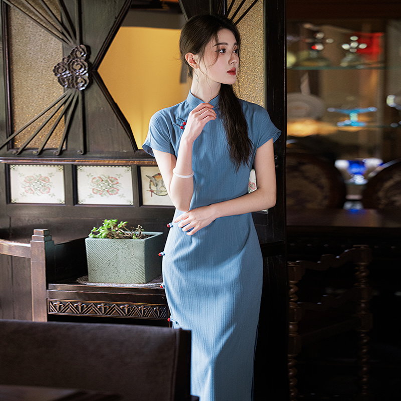 文艺少女装 日常可穿年轻款 蓝色复古风改良旗袍2025年夏新款 新中式