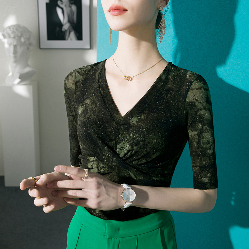 女五分袖 淑女洋气女装 修身 中袖 上衣 2025秋季 亮丝印花V领打底衫