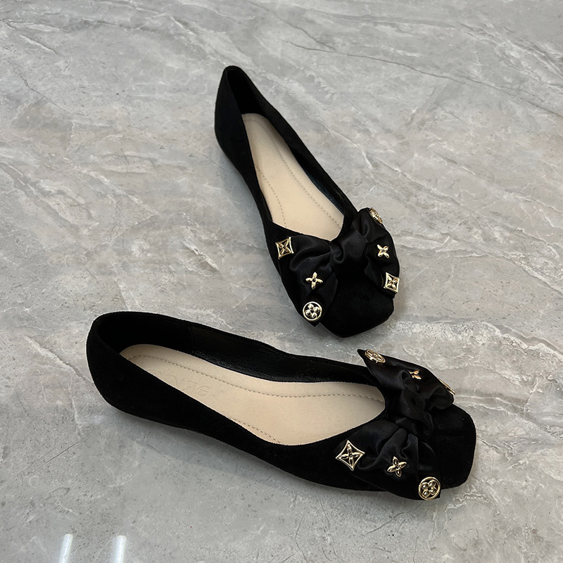 女2025夏季 瓢鞋 新款 小香风蝴蝶结黑色浅口平底大码 豆豆鞋 真皮单鞋