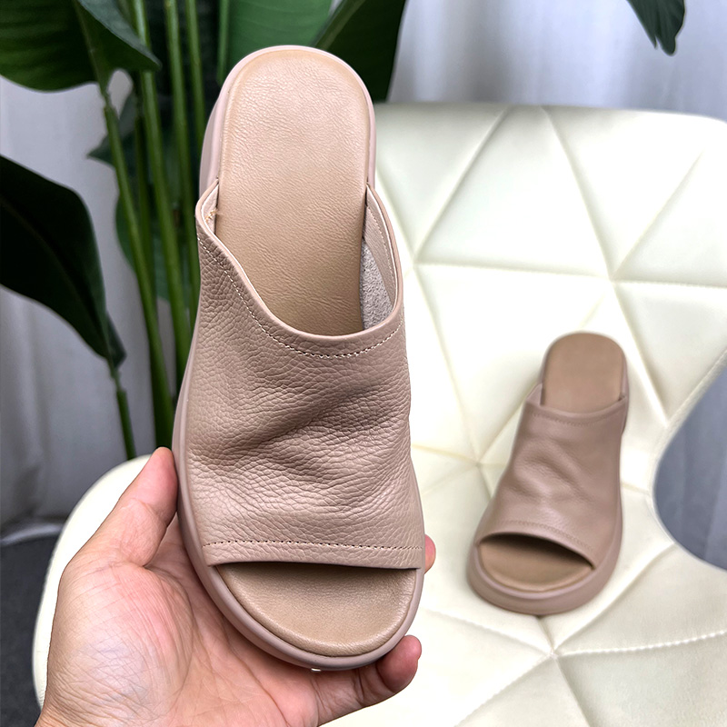 女头层牛皮软底粗跟厚底鞋 鱼嘴凉鞋 拖鞋 时尚 2024夏季 外穿拖鞋 新款