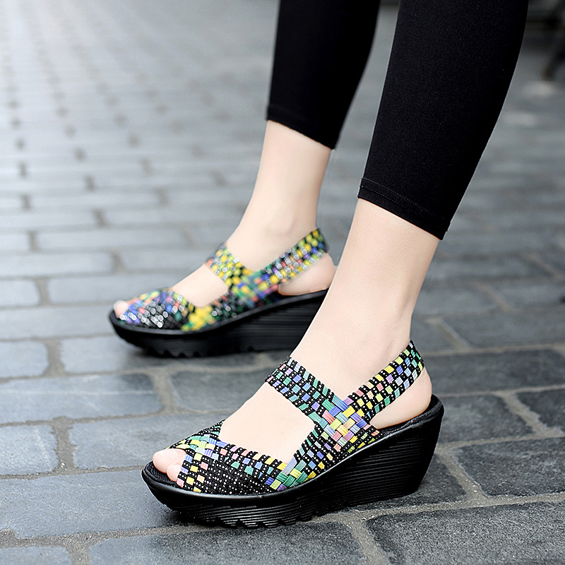 夏季 女士 手工松紧弹力编织网透气软厚底增高休闲妈妈松糕鱼嘴凉鞋