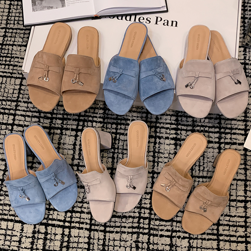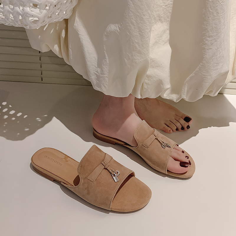 LP平底外穿真皮羊反绒半拖粗跟复古懒人露趾一字凉拖网红舒适女鞋