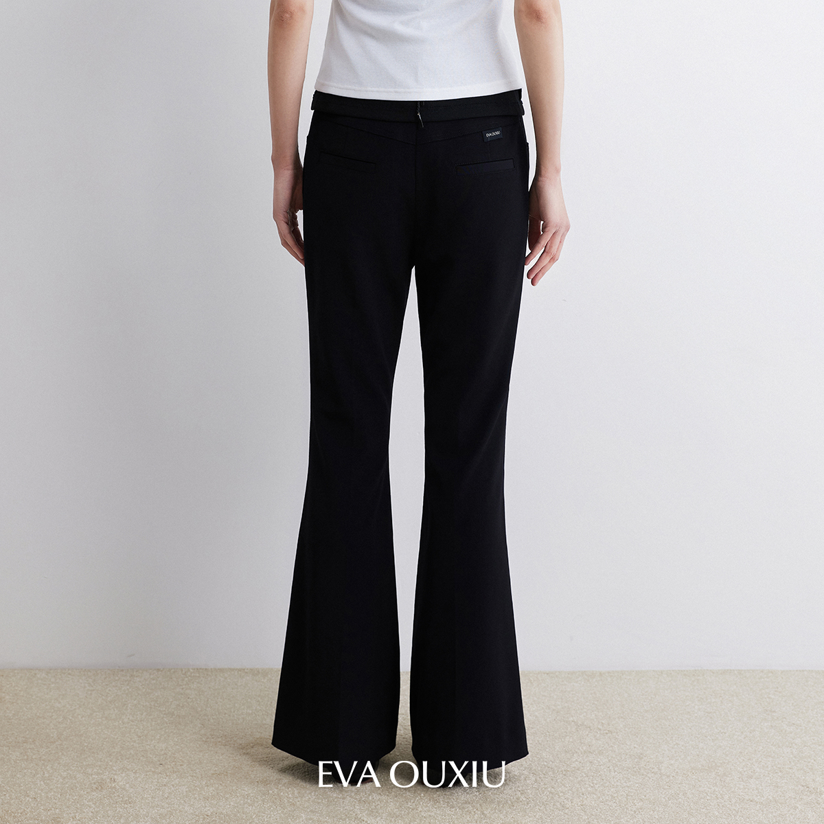 通勤高腰显瘦微弹休闲裤 EVAOUXIU商场同款 重磅醋酸黑色微喇长裤