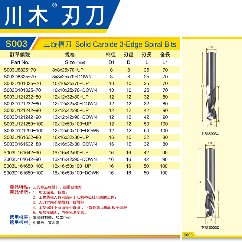 10木工电脑雕刻机24S003 川木刃刀槽刀类三螺旋槽刀8