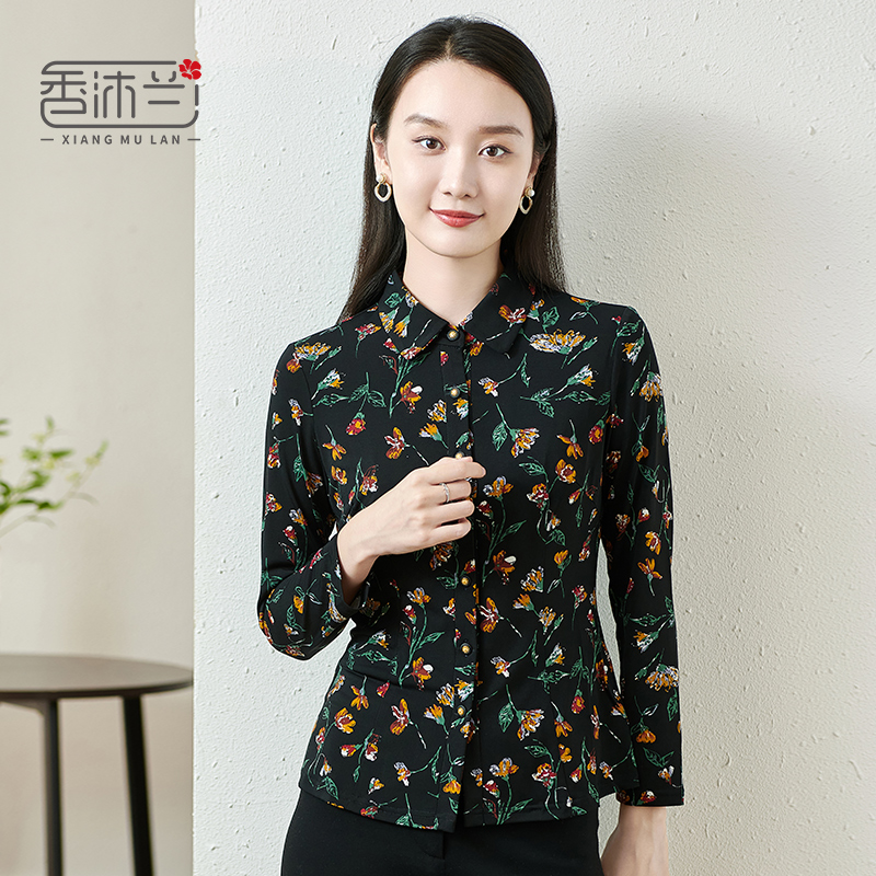 显瘦大码 弹力印花上衣时尚 女装 长袖 香沐兰2025春装 衬衫 新款