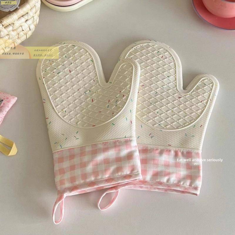 韩风ins粉色格子加棉糖针矽胶手套防滑耐热微波炉手套防烫隔热厚