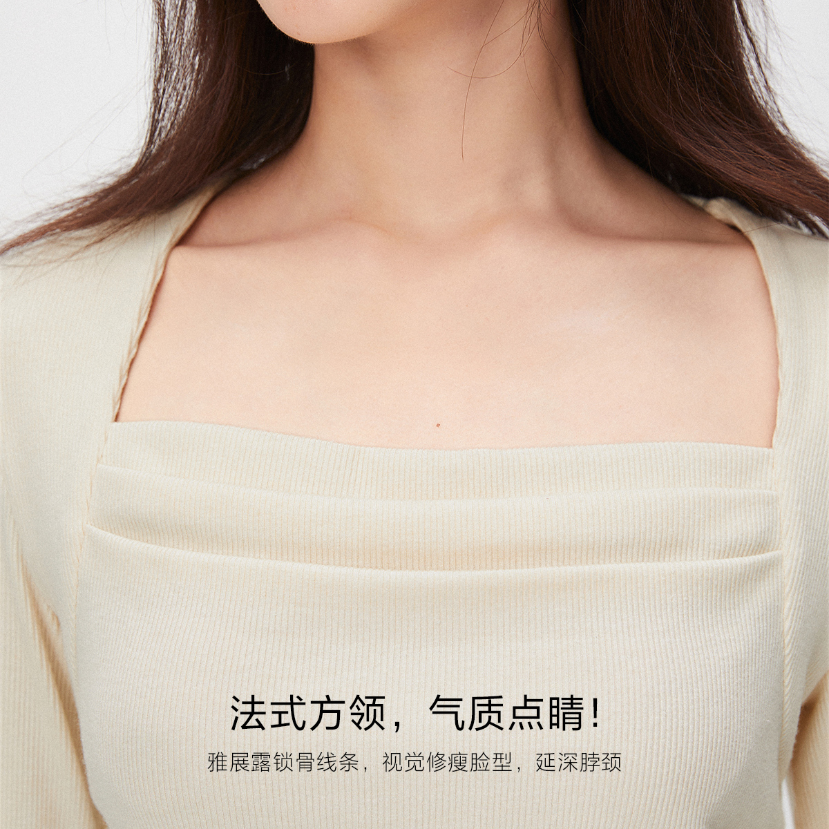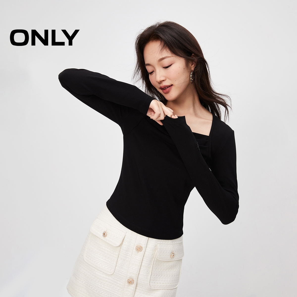 方领长袖 优雅气质同色字母褶皱设计修身 T恤女 新款 ONLY2025秋季