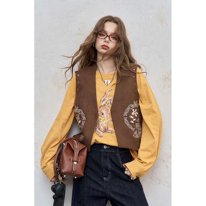新款 t恤女2025年秋季 休闲松弛感上衣 口袋黄色卡通印花长袖 妖精