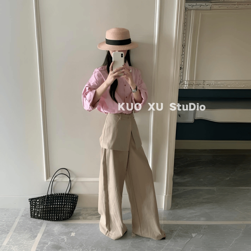 套装 早秋穿搭韩系小众百搭长袖 阔腿裤 上衣搭屁帘直筒西装 女 粉衬衫
