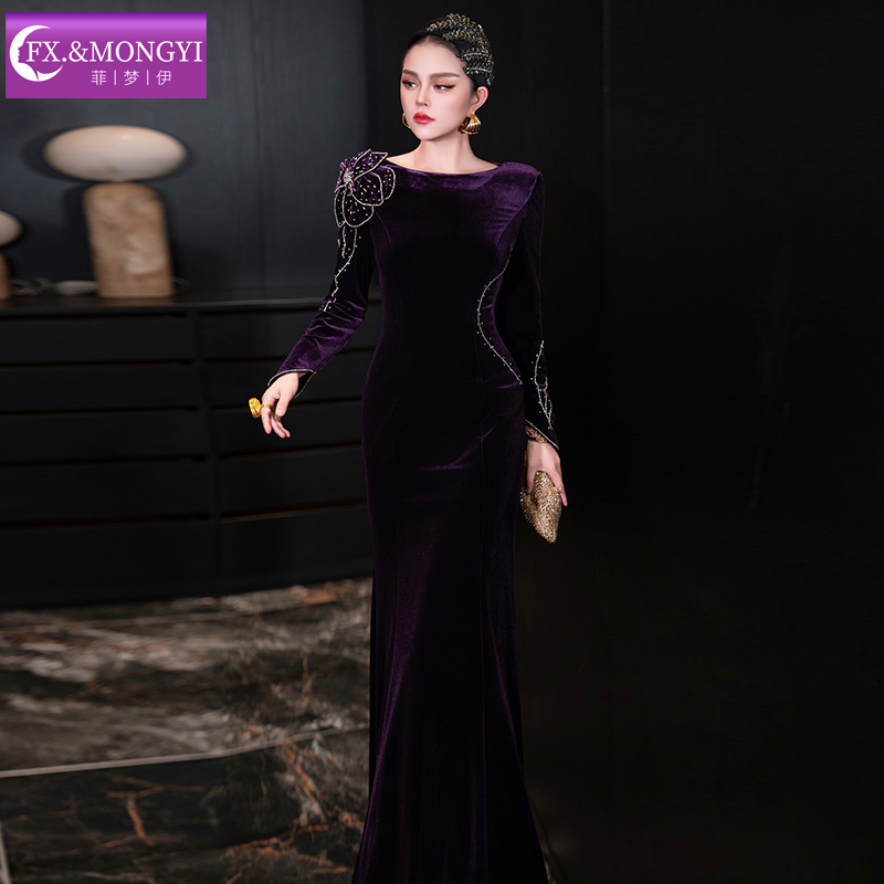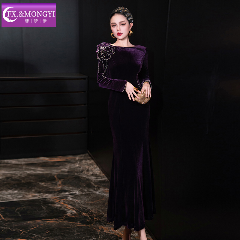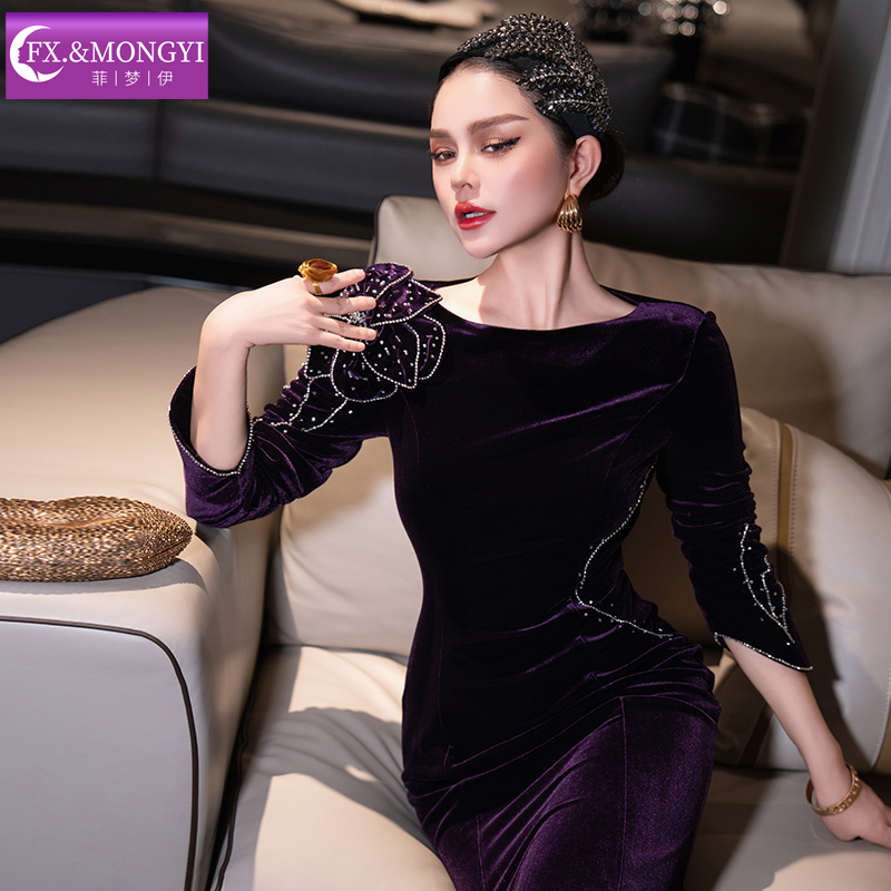 轻熟气质女人味礼服裙 法式 菲梦伊紫色钉珠金丝绒连衣裙女长袖 秋季