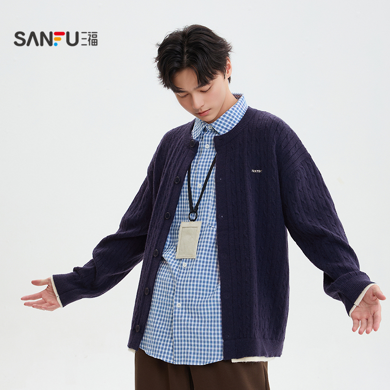 毛衣休闲宽松毛衫 小英文点缀绞花开衫 男510116 新款 三福2025冬季