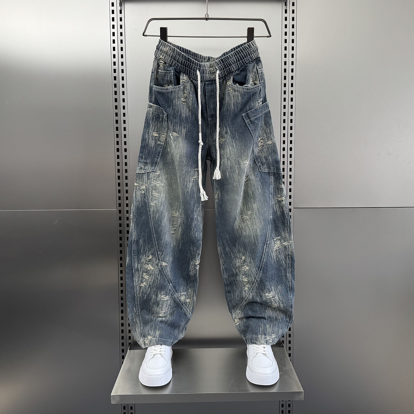 潮牌提花休闲裤 2025秋季 个性 男宽松阔腿裤 痞帅水洗磨破做旧牛仔裤