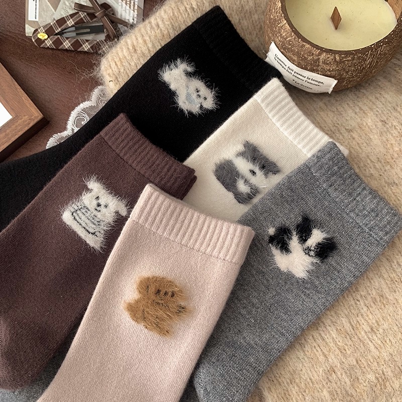 袜子女款 中筒袜春秋冬加厚保暖纯色棉袜日系可爱小狗羊毛堆堆长袜