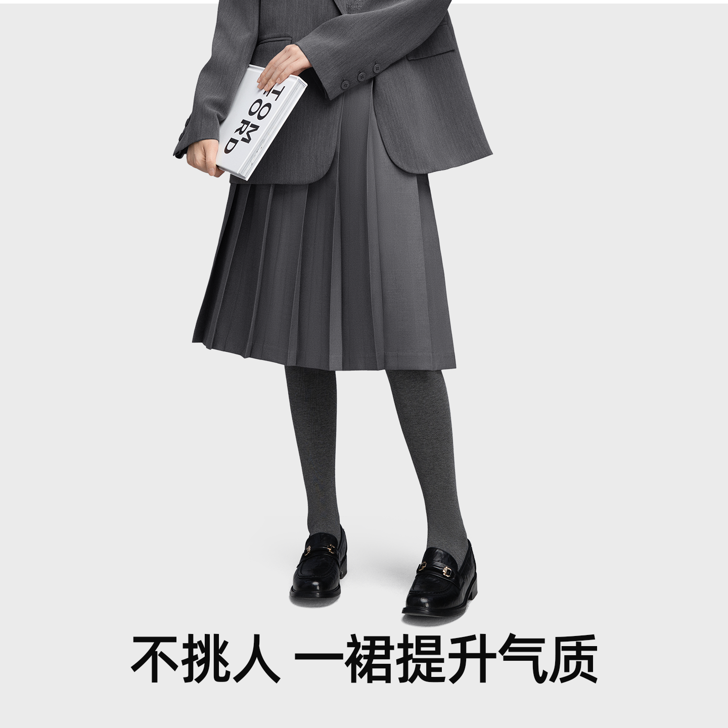 乐町甜美百褶针织短裙冬季 学院风半身裙金属标格雷系半裙