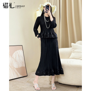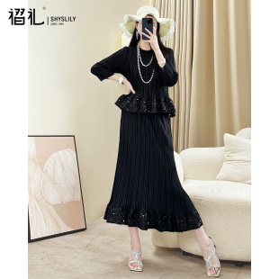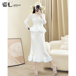 女2025新款 裙子洋气 春秋长袖 妈妈装 气质显瘦中长款 三宅褶皱套装